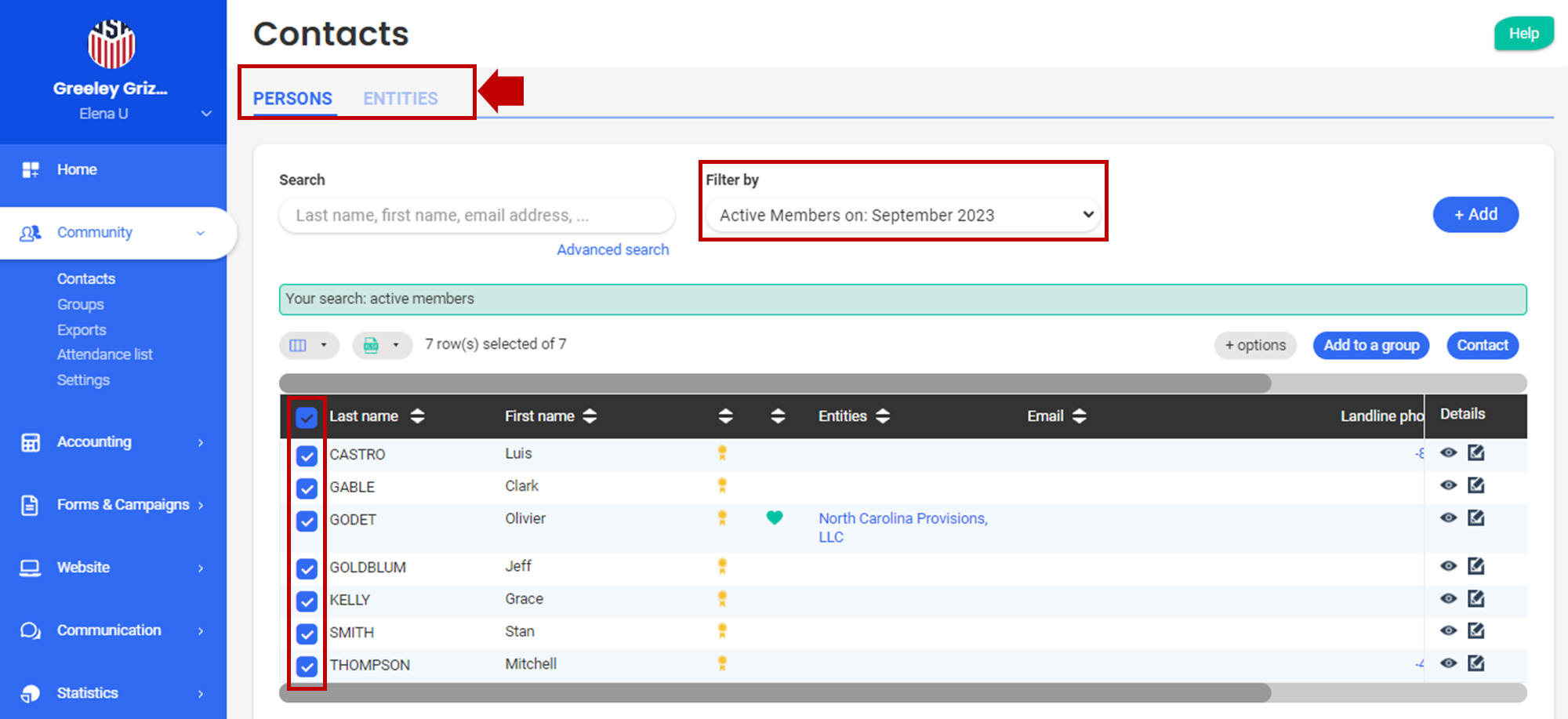 Go to your database, from Community > Contacts. If you have a subscription to the Professional offer, go to the tab that interests you: Persons or Entities. For other offers, you've come to the right place.