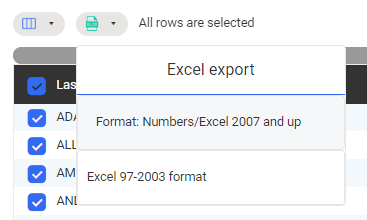 If you wish to select only part of the rows, use the various search options: search bar, filter or advanced search, and select lines by ticking the boxes to the left of the names.