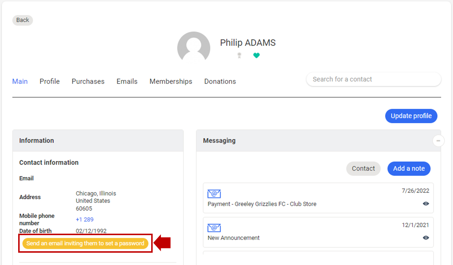 Then click on More options , choose Ask selected contact to set up their password, then validate.