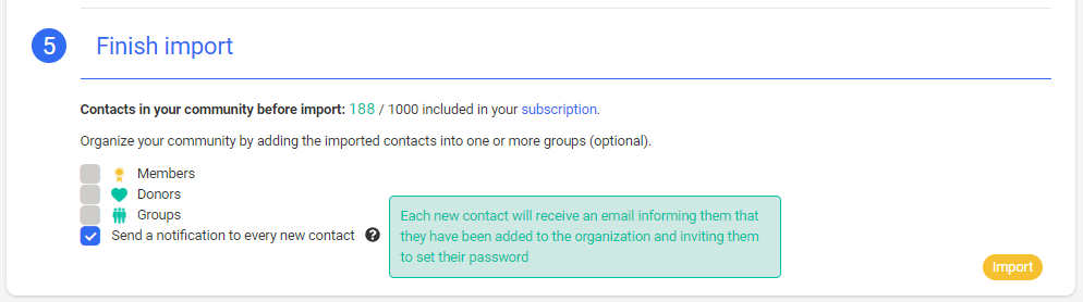 At the end of the import procedure, you can check (or uncheck) the Send a notification to every new contact box. So, after clicking on Import, added members will receive an e-mail informing them that an account has been created and inviting them to create a password for themselves.